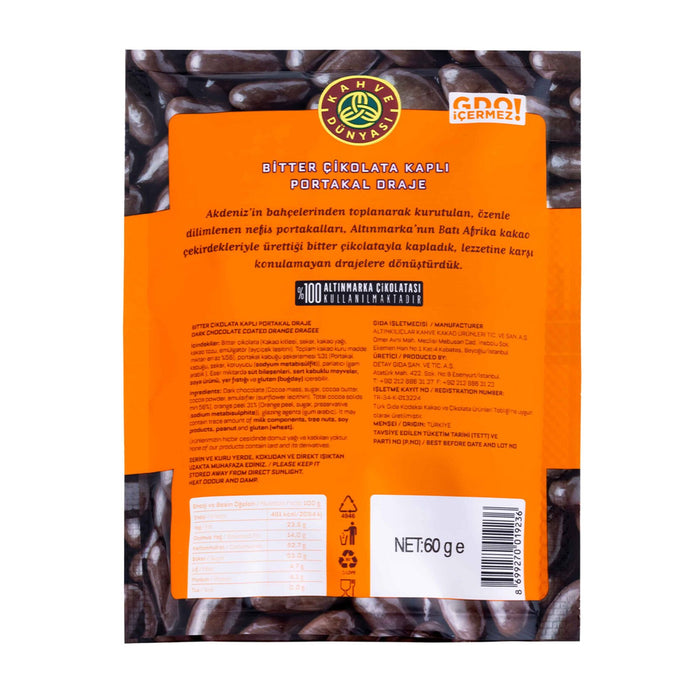 Experience the perfect combination of rich dark chocolate and zesty orange with Kahve Dünyası Dark Chocolate Orange Dragee. This premium Turkish chocolate treat blends the intense flavor of bitter chocolate with the sweet and tangy notes of candied orange peel, creating a gourmet snack that delights every bite.