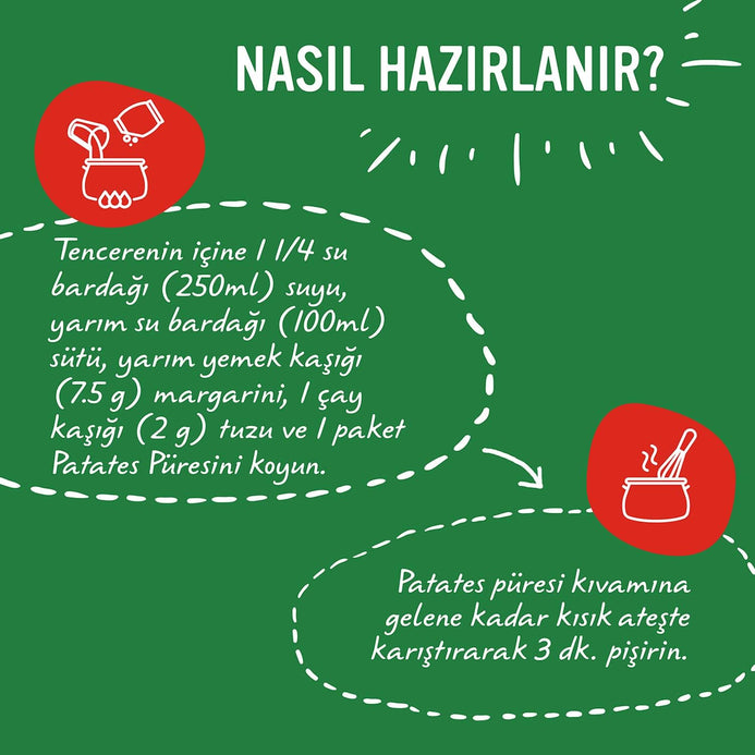 Knorr Patates Püresi does not contain any preservatives. With Knorr mashed potatoes you can prepare mashed potatoes in 5 minutes. To prepare mashed potatoes for 2 people; 1 pack of Knorr Mashed Potatoes, 250 ml. hot water, 125 ml. It is enough to add milk, 1 teaspoon of salt and 1 teaspoon of oil.