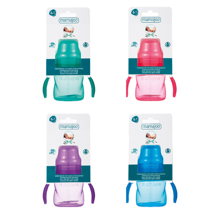 Mamajoo Handled Educational Cups are designed to help babies learn to drink by easily transitioning from bottle to cup.