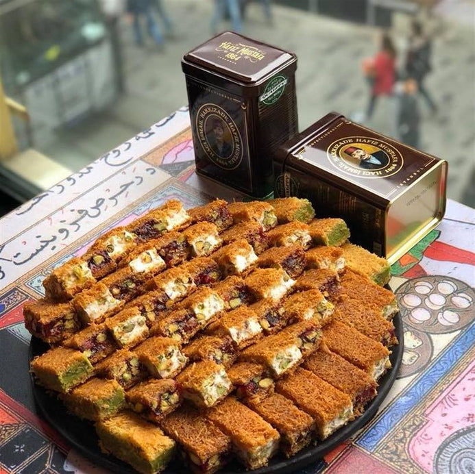 Ingredients: [Turkish Delight (water, sugar, corn starch, lemon juice, pistachio(14%), depending on type (vanillin, soapwort extract)],[Kadaif wheat flour with syrup, water, ghee, hydrogenated vegetable oil, lemon juice, sugar )].