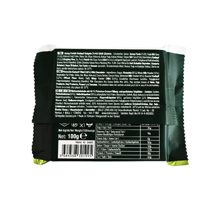 Ingredients: Sugar, Pistachio (%13), Whole Milk Powder (%13), Vegetable Oil (Palm, Shea, Sal, Illipe, Kokum). Cocoa Butter, Cocoa Mass, Skimmed Milk Powder (%6). Roasted Kadayif (%3.2) (Wheat Flour, Water, Salt), Whey Powder (Milk) (%14), Emulsifier (Sunflower Lecithin, Polyglycerol Polyricinolate), Flavoring (Vanillin), Milk Chocolate Cocoa Solids Min: 30%.