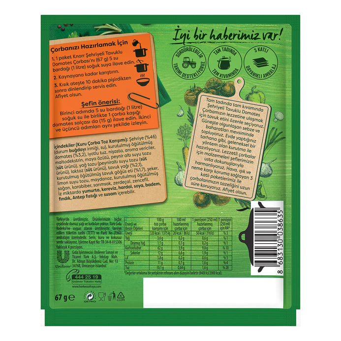 Knorr Noodle Chicken Tomato (Şehriyeli Tavuklu Domates) Soup, one of the most delicious soup varieties prepared with the recipes of Knorr chefs, is coming to your table to warm you up. Bringing together all the ingredients for your soup in a single package for you, Knorr is in your kitchen with the most delicious chef recipes. The delicious flavor coming from carefully selected chickens is in its full taste and consistency in Knorr Chicken Tomato Soup with Noodles! In order to bring the irresistible taste of tomato soup with chicken and noodle into your kitchen, which will be good for you in winter days, we carefully select chicken meat, support sustainable agriculture and collect sun-ripened vegetables and spices in season. Just like tarhana, we dry carefully selected vegetables with traditional methods that you make at home. Moreover, we preserve the freshness of our soups for a long time with our 3-layer packages that provide protection against air, light and humidity.