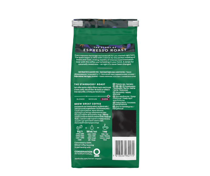 It all started in 1975 with the search for the perfect blend of coffee beans and roasting profile. After months of intensive testing, we reached this special espresso roast coffee in your hands. The caramel flavor was so on point that the recipe was never changed again. STARBUCKS® Dark Roast coffee brings the barista experience to your home with its full body and intense roasted structure.