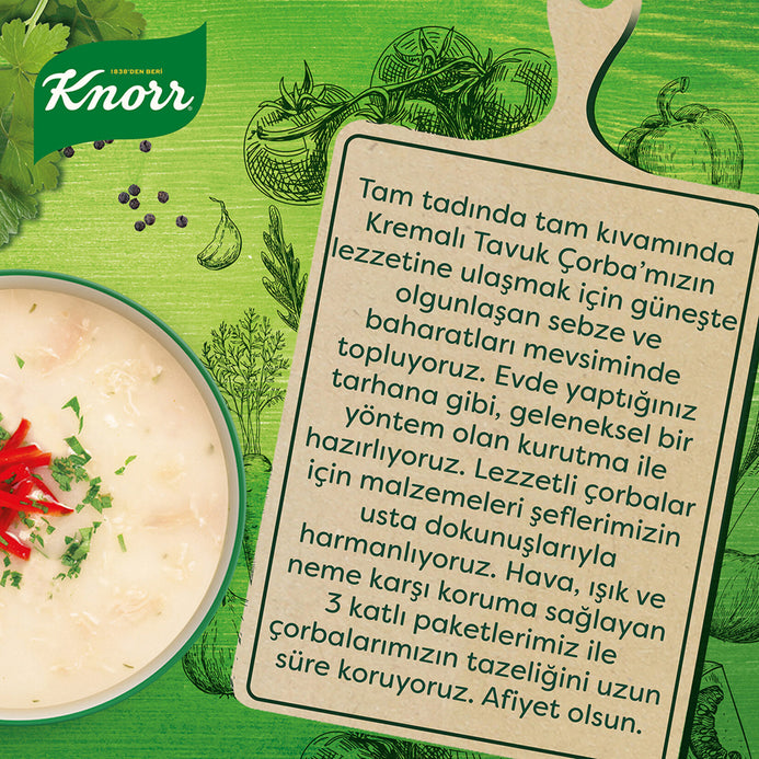 Knorr Creamy Chicken Soup, one of the most delicious soup varieties prepared with the recipes of Knorr chefs, is coming to your tables to warm you up. Knorr has gathered all the necessary ingredients for your soup in one package for you. The delicious taste coming from the carefully selected Banvit chickens is in its full taste and consistency in Knorr Creamy Chicken Soup! We carefully select chicken meat to reach the taste of Knorr Creamy Chicken Soup, which is a delicious and satisfying meal. We attach importance to sustainable agriculture and collect sun-ripened vegetables and spices in season. Just like tarhana, we dry carefully selected vegetables with traditional methods that you make at home. Moreover, we preserve the freshness of our soups for a long time with our 3-layer packages that provide protection against air, light and humidity.
