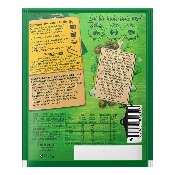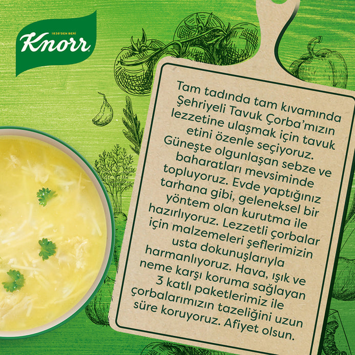 Knorr Chicken Noodle Soup (Hazır Çorba Şehriyeli Tavuk), one of the most delicious soup varieties prepared with the recipes of Knorr chefs, is coming to your tables to warm you up. The delicious taste of Banvit chickens is in its full taste and consistency in Knorr Chicken Noodle Soup! We carefully select chicken meat to reach the taste of Knorr Chicken Noodle Soup with its full taste and consistency. We bring together all the necessary ingredients for your soup in a single package for you. We attach importance to sustainable agriculture and collect sun-ripened vegetables and spices in season. Just like tarhana, we dry carefully selected vegetables with traditional methods that you make at home. Moreover, we preserve the freshness of our soups for a long time with our 3-layer packages that provide protection against air, light and humidity.