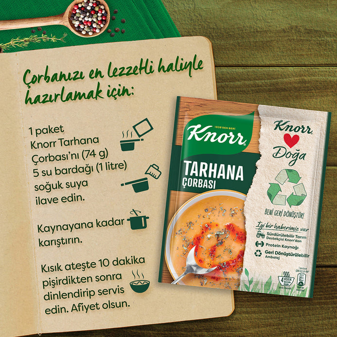 1. Add 1 pack of Knorr Tarhana Soup (74 g) to 5 glasses (1 liter) of cold water. 2. Stir until boiling. 3. After 15 minutes of cooking on low heat, let it rest and serve. Enjoy your meal.