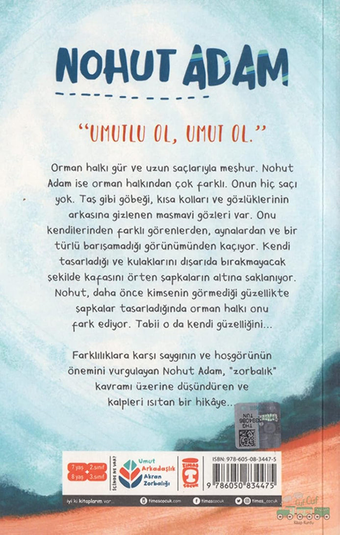 Orman halkı gür ve uzun saçlarıyla meşhur. Nohut Adam ise orman halkından çok farklı. Onun hiç saçı yok. Taş gibi göbeği, kısa kolları ve gözlüklerinin arkasına gizlenen masmavi gözleri var. Onu kendilerinden farklı görenlerden, aynalardan ve bir türlü barışamadığı görünümünden kaçıyor. Kendi tasarladığı ve kulaklarını dışarıda bırakmayacak şekilde kafasını örten şapkaların altına saklanıyor.
