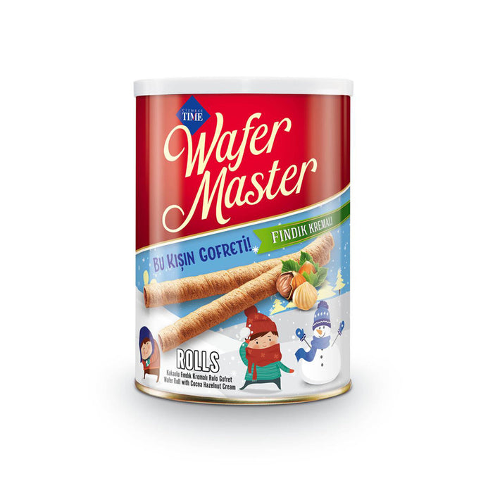 Enjoy the festive taste of Cizmeci Time Wafer Master Winter Edition in a charming tin box, perfect for sharing or gifting. These crispy rolled wafers are filled with a rich hazelnut and cocoa cream, offering a delightful crunch in every bite. The special winter-themed tin keeps the wafers fresh and makes for a collectible keepsake.
