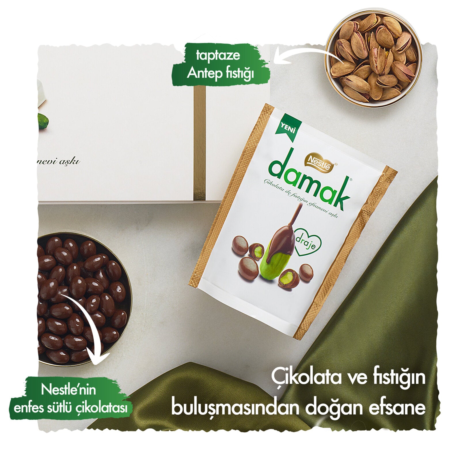 - Premium milk chocolate with 20% Antep pistachios