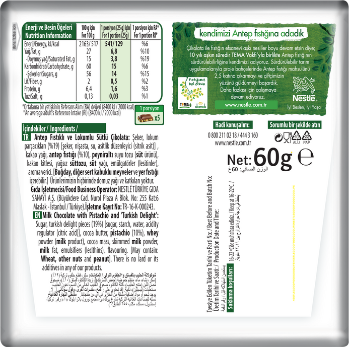 Nestle Damak Turkish Delight Chocolate brings together the perfect harmony of Turkish delight and pistachio chocolate. The soft Turkish delight filling and Damak's unique pistachio chocolate delight your palate with every bite. This special chocolate, which brings together both traditional and modern flavors, calms your sweet cravings with a stylish taste.