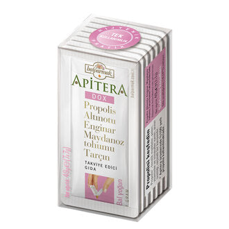Apitera Dox is a supplementary food consisting of a combination of bee secretion propolis with honey and various forms of Altinotus, Gunpowder Bark, Artichoke, Parsley seed and Cinnamon.