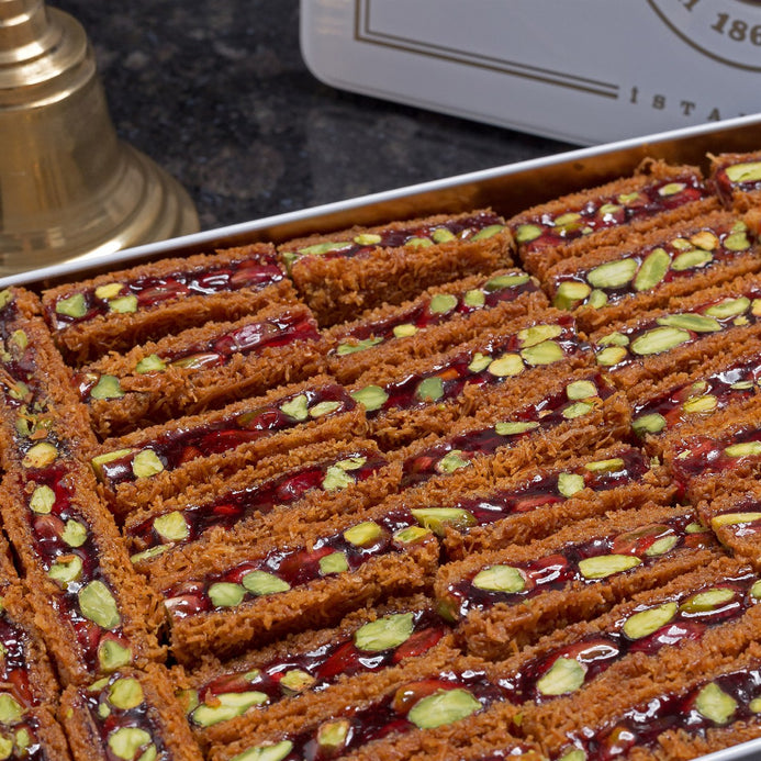Ingredients: [Turkish Delight (water, sugar, corn starch, lemon juice, pistachio (14%), depending on type (pomegranate flavoring, coloring (anthocyanin)]), [Kadaif with syrup (wheat flour, water, ghee, hydrogenated vegetable oil, lemon juice, sugar)].