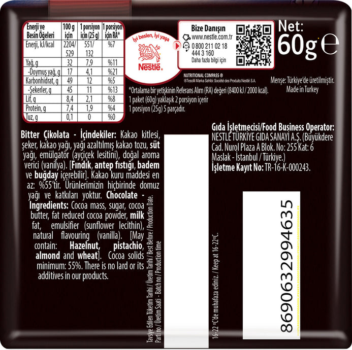 Nestle 55% Dark Chocolate Bar offers a rich and satisfying cocoa experience with a minimum of 55% cocoa solids. Crafted in Türkiye, this square-shaped dark chocolate bar delivers a bold flavor profile perfect for true chocolate lovers. Whether you're enjoying it as a treat or using it in baking, its smooth texture and deep cocoa taste make it a versatile favorite.