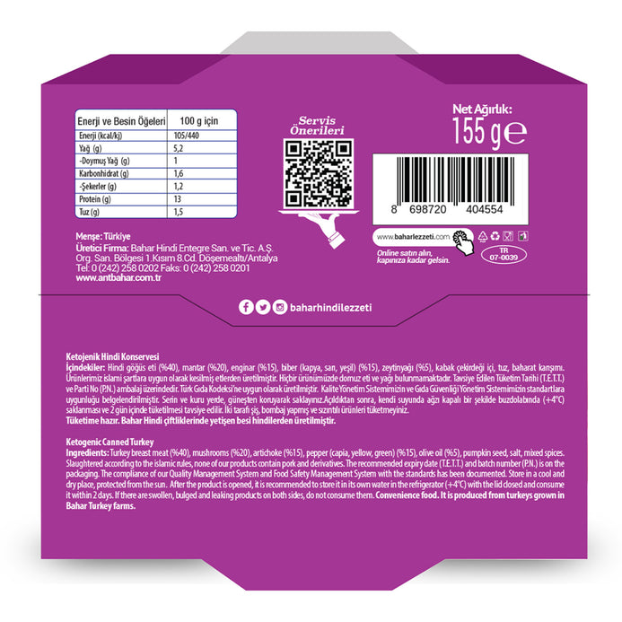 Ant Bahar Ketogenic Turkey with Vegetables is a wholesome ready-to-eat meal made with 40% cooked turkey breast, olive oil, and a mix of fresh vegetables like mushrooms, artichokes, and colorful peppers. Perfect for those following a ketogenic diet, this convenient canned dish is rich in healthy fats and protein, with no added allergens.