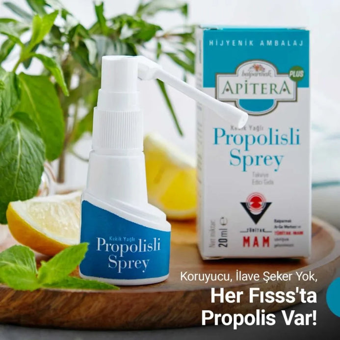 Apitera Propolis Spray is a natural and additive-free food supplement developed in collaboration with TÜBİTAK Marmara Research Center (MAM) and Balparmak R&D Center. This spray-form product, which has an ideal formula for daily use, provides both easy and hygienic application thanks to its practical design and protective packaging.