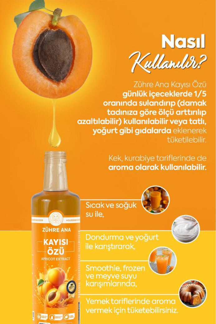 Zühre Ana Kayısı Özü is a rich, concentrated apricot extract made from carefully selected apricots using traditional methods. This thick, naturally sweet fruit essence delivers the deep aroma and vibrant flavor of sun-ripened apricots in every spoonful.
